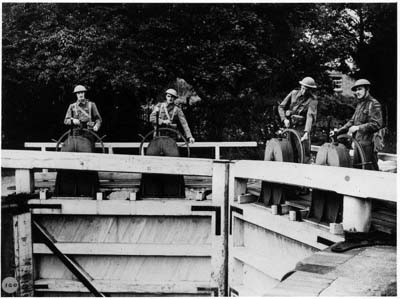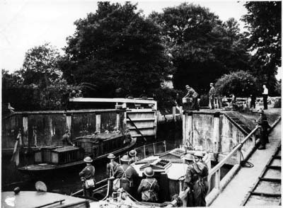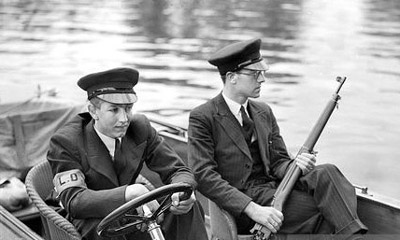 Two young men from Henley making ready to join the UTP review at Henley Sailing Club, Wargrave, 28/07/40. Taken at Shiplake lock. Thomas Ashley Church (holding the rifle) and Richard Hobbs.
