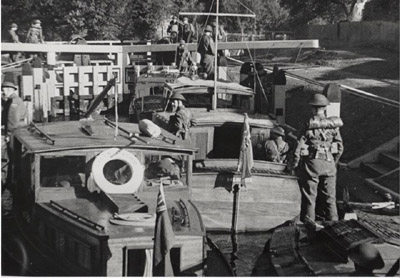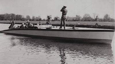 Baby Greyhound, a 50ft slipper launch requisitioned by the UTP in 1942, shows a sign of the UTP HQ on the boat, this is spring 1944. US officers on board, General Eisenhower, General Launton-Collins (known at Lightning Joe), Chief of Staff Bedwell-Smith, near Windsor Castle.